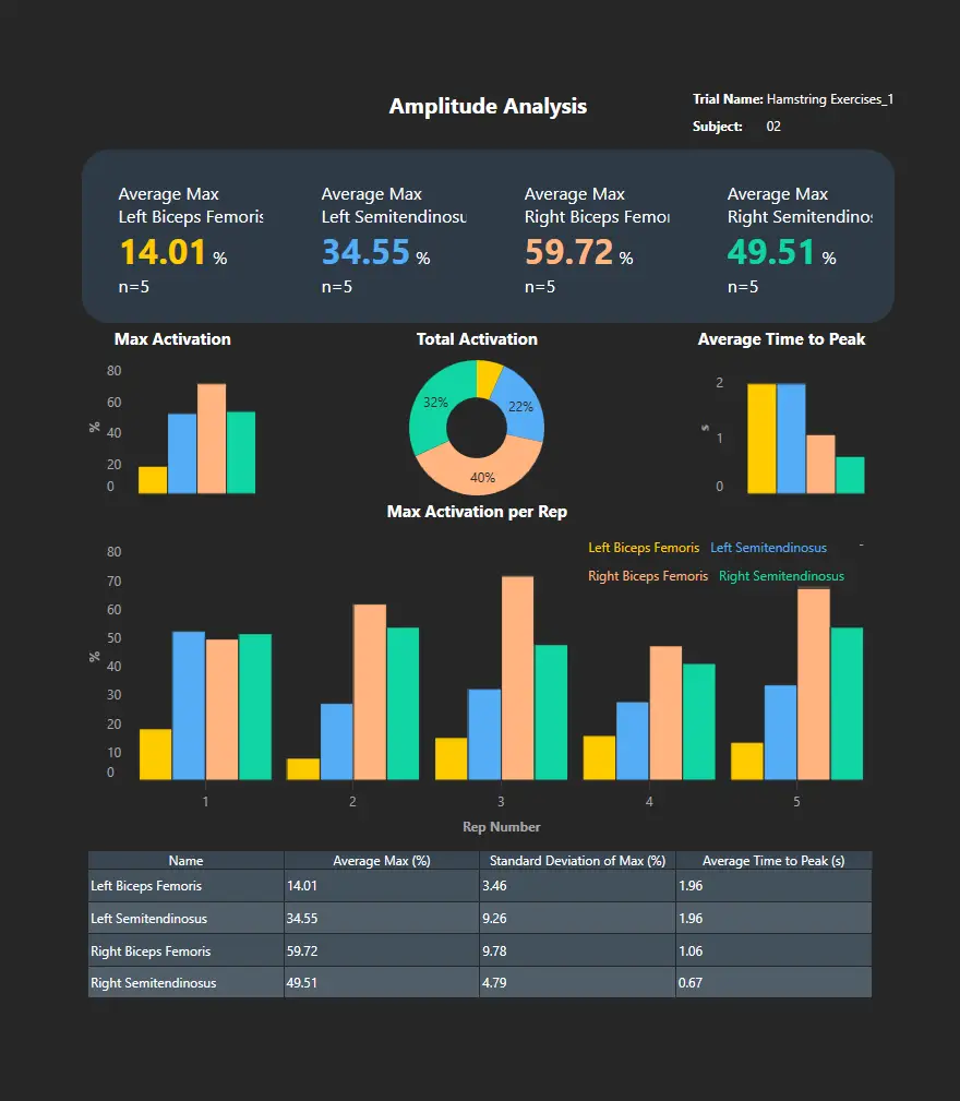 Using the Trigno Analytics feature, reports were generated immediately after each exercise. Across the session, the right hamstrings typically showed higher activation levels than the left, reflected in both higher Average Max (%MVC) and a larger share of Total Activation. The standout finding was the under-recruitment of left BF across most tasks alongside comparatively high activity in the other muscles measured, illustrated clearly by the Amplitude reports for Bridges (Figure 1) and Romanian Deadlifts (Figure 2).