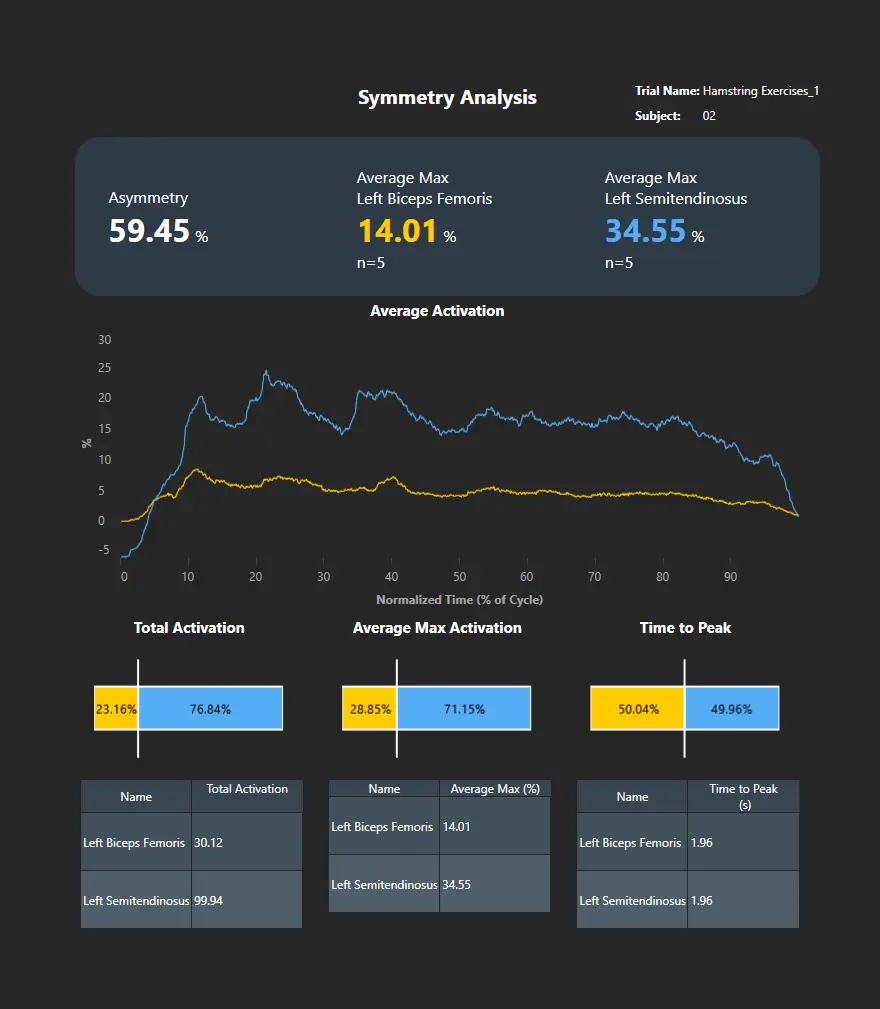 By measuring activity from the biceps femoris and semitendinosus on both legs, practitioners can see the relative contributions of each muscle during specific exercises. When used in this context, EMG helps practitioners use common exercises as a screening tool, revealing which muscles are most optimally recruited and what needs to change to allow an athlete to progress or reduce injury risk.