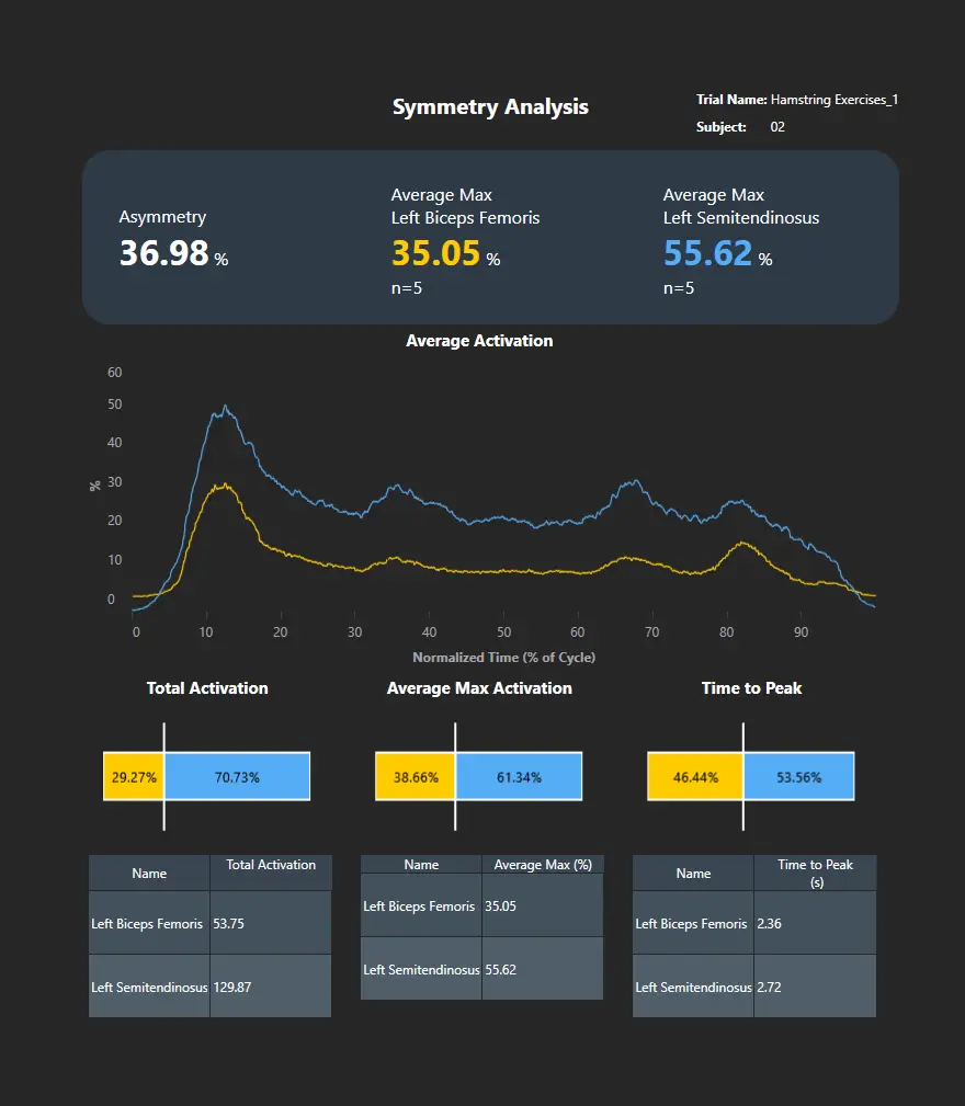 Beyond jump and strength outputs, EMG shows which hamstrings are being recruited within each exercise, exposing asymmetries and compensations.
