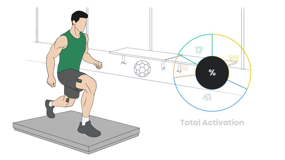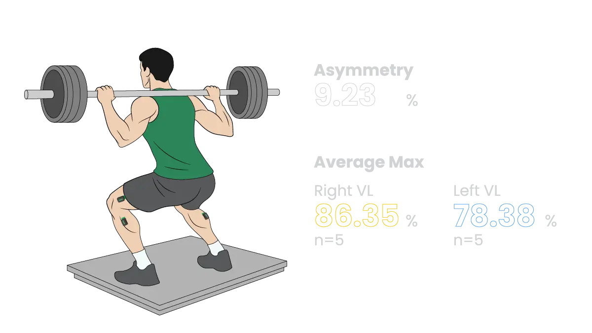 During squats, athletes may offload to the opposite leg due to injury compensations or improper technique. EMG can reveal left–right differences in quadriceps activation, helping identify asymmetries and promote more balanced muscle recruitment.