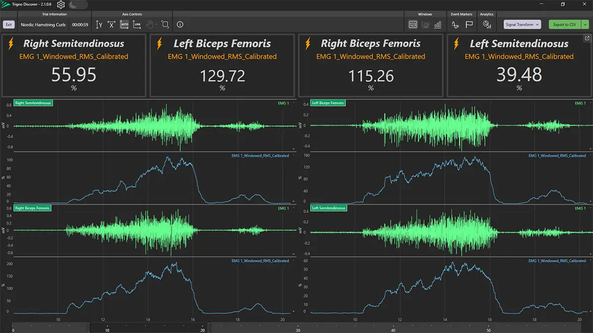 Comparing left vs. right sides, or muscles within a muscle group, for amplitude, timing, or patterns. This analysis is essential for return-to-play and injury prevention monitoring.