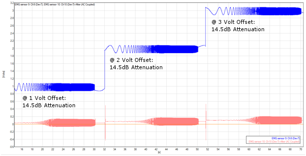 Note the effect of the AC coupling filter on the signal. (Blue is an unfiltered sweep from 100 mHz to 500 Hz, with a varying offset of 0, 1, or 2; Red is the filtered result)