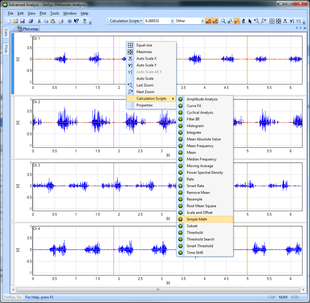 2. Move the X cursors in the upper plot to surround the middle four bursts of EMG activity. Right click on the data and select Calculation Scripts > Simple Math.