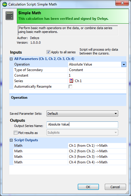 2. The Simple Math dialog box will appear. In the Operation parameter drop-down menu choose Absolute Value. Given this operation type, all other parameters are not used, yet still need to be valid. Although a Series parameter is not used, you still must choose one by click on the (...) symbol in the entry field and choosing any data series from the workspace. In the bottom half of the window (the Outputs section), click in the Output Series Name field and rename it to Absolute Value. Check the Plot Results checkbox, and make sure that as Subplots is selected from the corresponding drop-down.