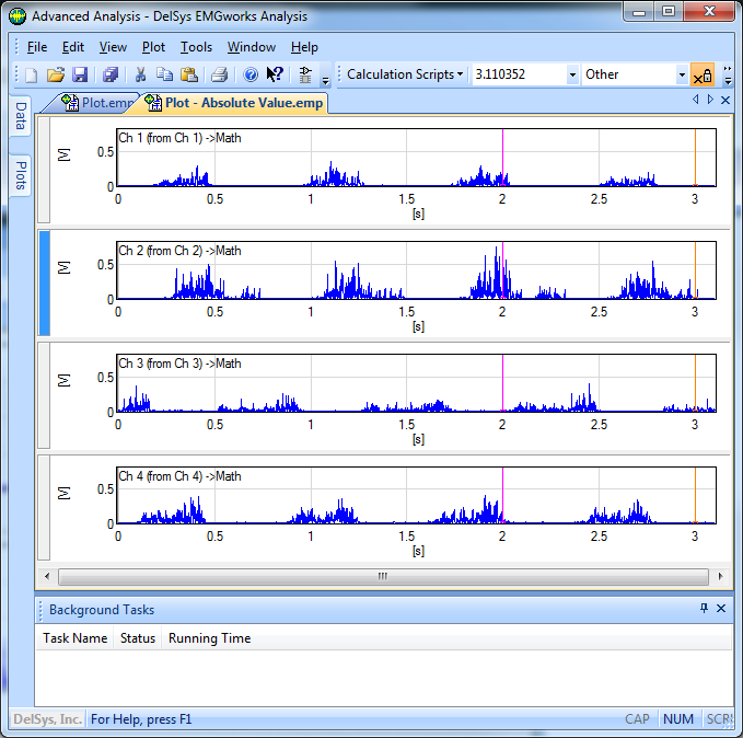 Instead of performing a calculation on all of the data in the Data Files, only the desired data will be selected. The absolute value will be calculated for this selected data so that the EMG bursts are only represented by positive deflections.