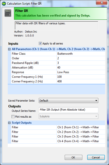 1. Right click the Absolute Value Data File in the workspace and choose Calculation Scripts > Filter IIR from the menu. The Filter IIR dialog box will appear as shown below.