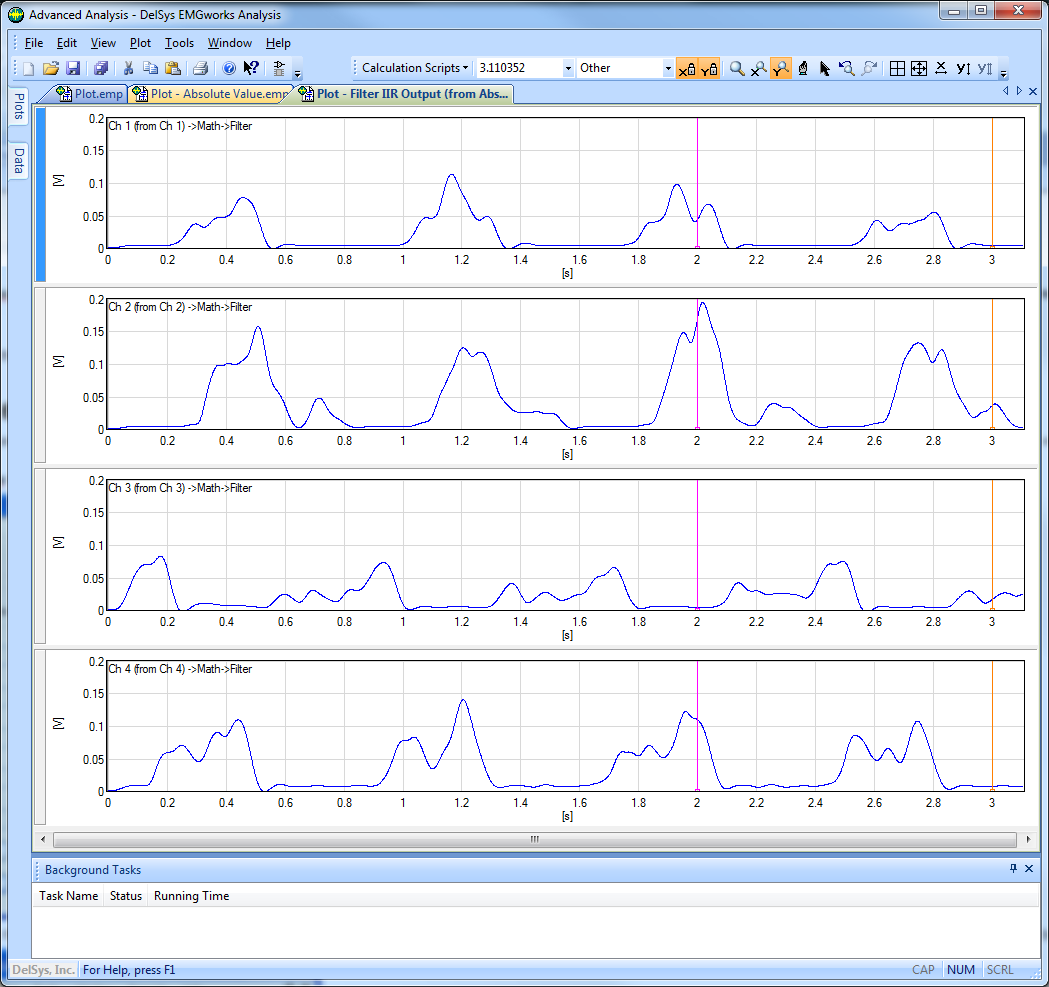 The result from the absolute value calculation will now be filtered. The goal is to use a low-pass filter is to remove frequency components in the signal greater than 10Hz in order to obtain only the outline of the EMG bursts rather than the point to point variation in the amplitude.