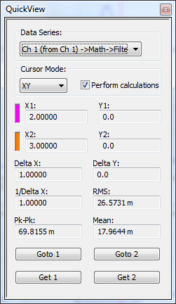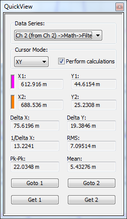 2. Select the third Subplot in the Plot and move the Y2 cursor to the height of the the smallest peak. Also move the X1 and X2 cursors to the two extremes of the widest trough that is below the Y2 cursor in the second Subplot.