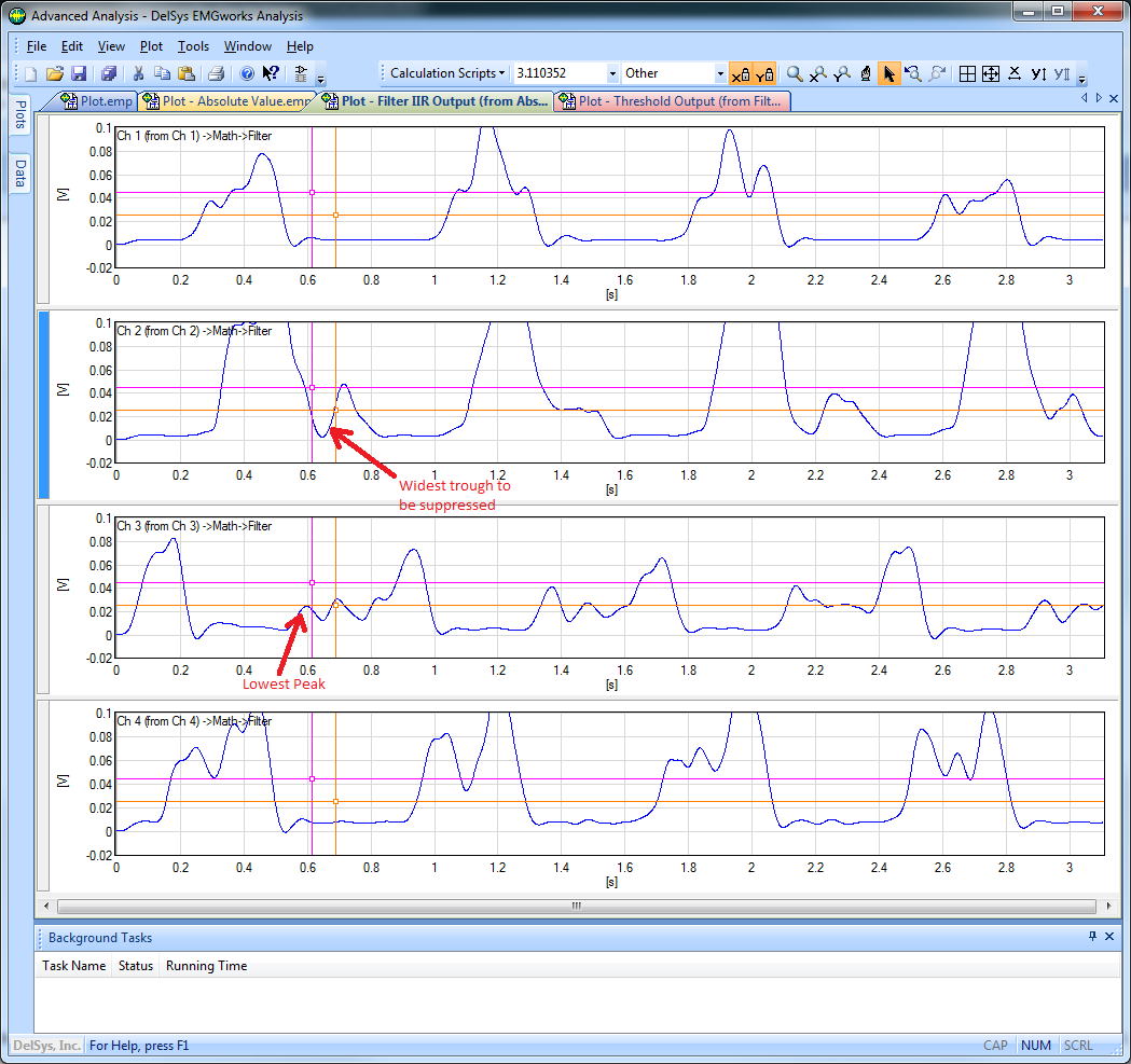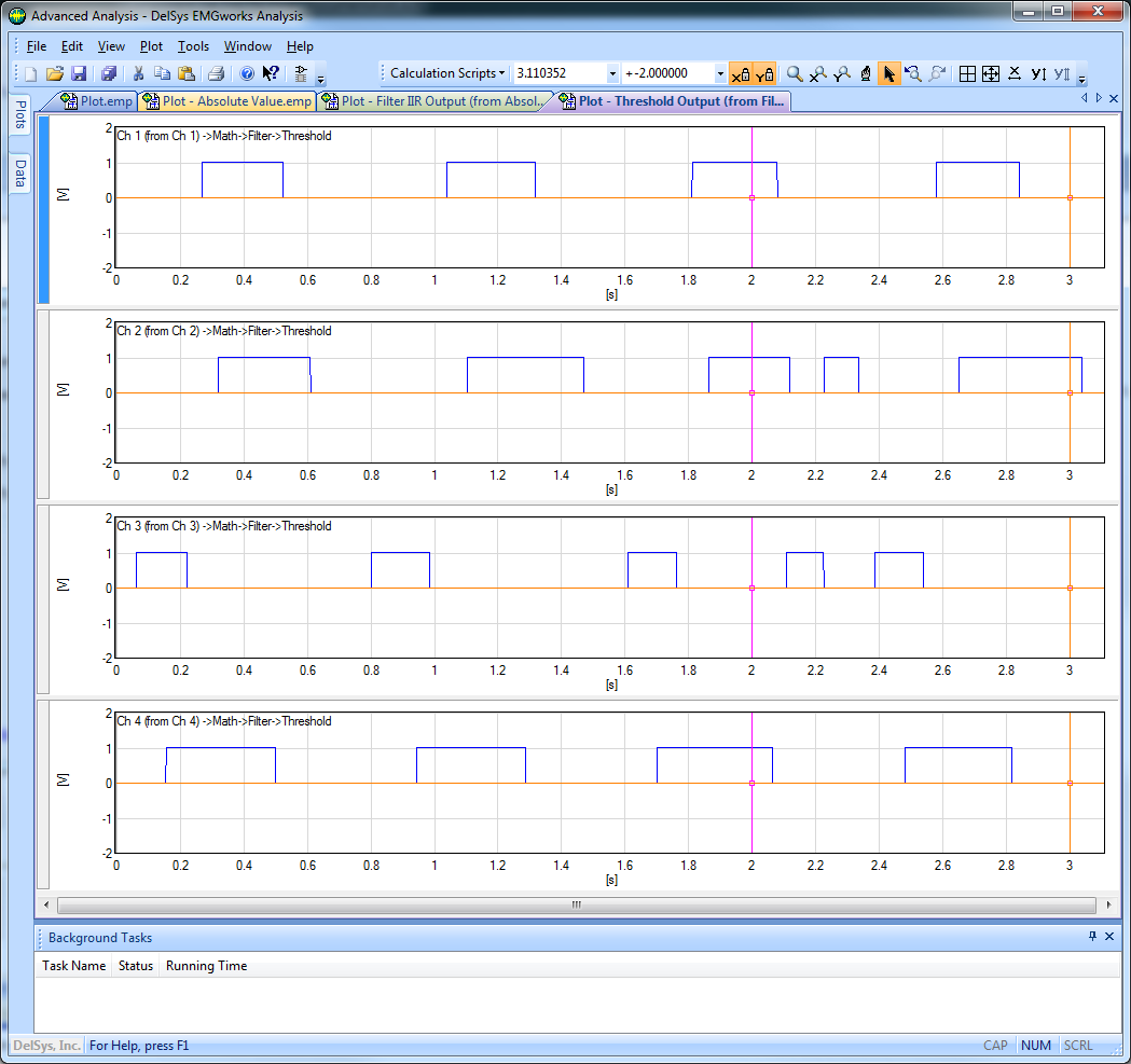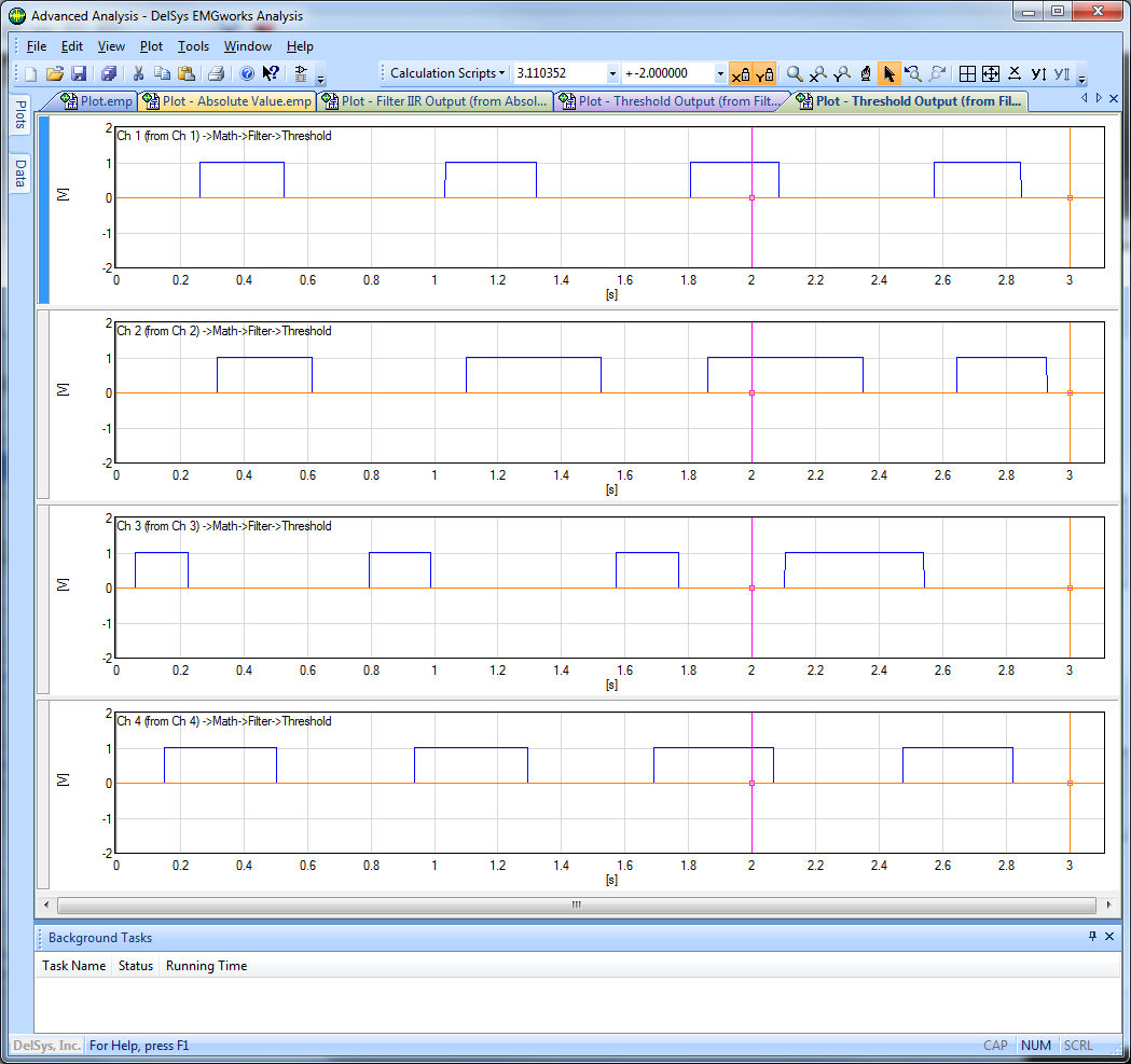 The Quickview window will be used to determine an estimation of the parameters to be used in the THRESHOLD calculation. The goal of the threshold calculation is to determine intervals where the bursts of EMG activity exceed a desired threshold