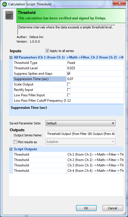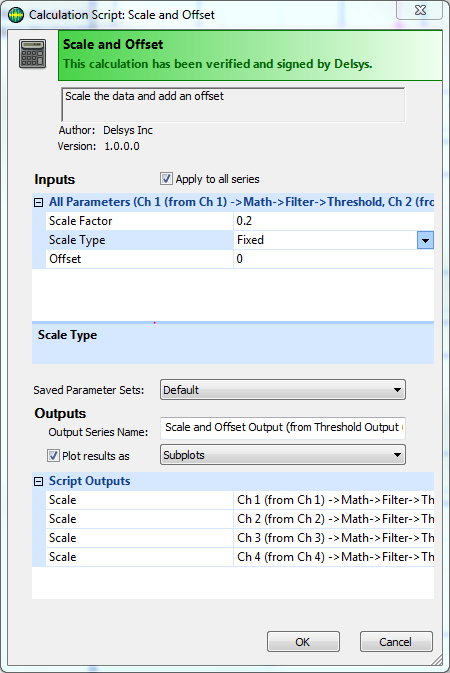 8. Right click on the "Threshold Output" data in the workspace and select Calculation Scripts > Scale and Offset. Enter a value of .2 for the Scale Factor, and select Fixed for the Scale Type parameter. Check the Plot Results box. Click the OK button.