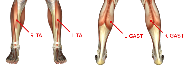 The fifth sensor will only be collecting impact filtered accelerometer data, meant to capture step actions. Place this sensor on the left foot, near heel with the arrow on the sensor pointed up along the lower leg. This orients the x-axis up, meaning that the X channel is the one that will contain the most accurate data.