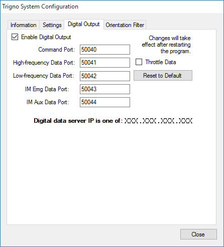 The port numbers refer the the ports which need to be connected to via TCP when using the Delsys SDK. The command port receives all setup and run time commands and replies to the user with confirmations of the commands. The high-frequency data port in a typical hybrid sensor setup will stream the EMG data only, and the low-frequency data port in a typical hybrid sensor setup will stream the ACC data only. No data sent over these ports to the Delsys SDK server will be acknowledged. The default values for the port numbers are usually unused in default Windows installations. Pressing "Reset to Default" will reset the port numbers to the default values: Command Port = 50040, High-frequency Data Port = 50041, Low-frequency Data Port = 50042.