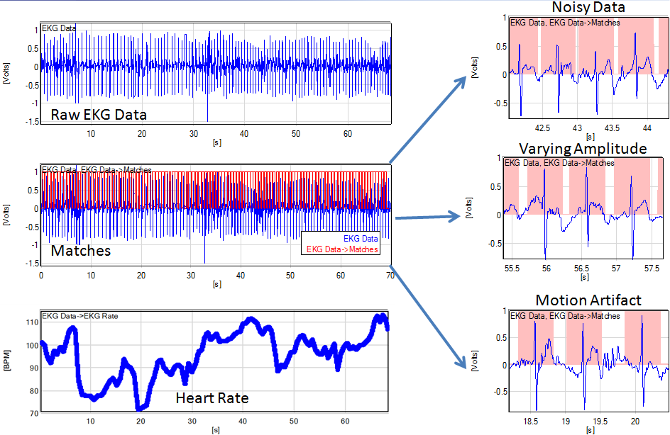 EKG Rate uses several other scripts to produce a heart rate with respect to time data series. The first step is to use the Template Matching script to determine where each beat is. The template is automatically. The output from this is fed into the Rate script, which calculates the rate of rising edges in a data series. After scaling, a data series representing BPM as a function of time is produced. The image below depicts the original data, the matches (including closeups of "bad" data sections that were still matched), as well as the final Rate output: