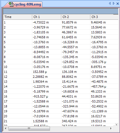 The GridView window displays the data values for each of the Data Series in a Data File in table format. It is opened for a Data File by first selecting the desired Data File by left clicking on it in the Workspace window. The Data File will be highlighted in blue. It is then possible to choose View > Gridview from the Main Menu or right click on the Data File and choose Gridview from the pop-up menu.