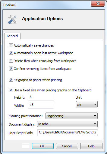 The Options dialog box allows the user to specify several preferences for the performance of EMGworks Analysis.
