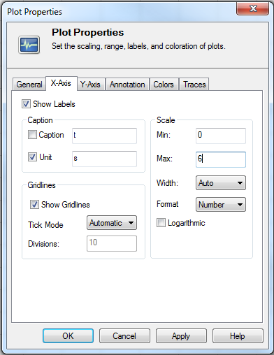 The X-Axis tab allows the user to specify preferences for the appearance of the X-axis.