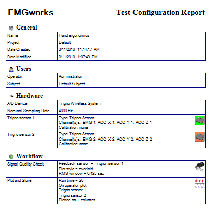 Creates a printable report which shows all of the settings of the configuration in great detail. The printed report can document an experiment which was performed, or to be performed as a part of a consent form. The report shows the test operator and subject, the hardware settings, the sensors (including their calibration and the channels assigned to each), and the workflow steps in the configuration.