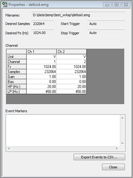 The Properties window displays parameters for a specified Test File or Data File. It is opened by first selecting the desired Test File or Data File by left clicking on it in the Workspace window. The Test File or Data File will be highlighted in blue. It is then possible to choose View > Properties from the Main Menu or right click on the Test File or Data File and choose Properties from the pop-up menu.