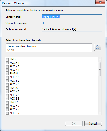 Changes the assignment of channels for this sensor to any set of channels on any hardware device. From the drop down, any hardware device can be selected, and all of the un-allocated channels on that device are shown. The action required field shows how many channels remain to be assigned. Every channel in the sensor must be assigned to an A/D input channel.