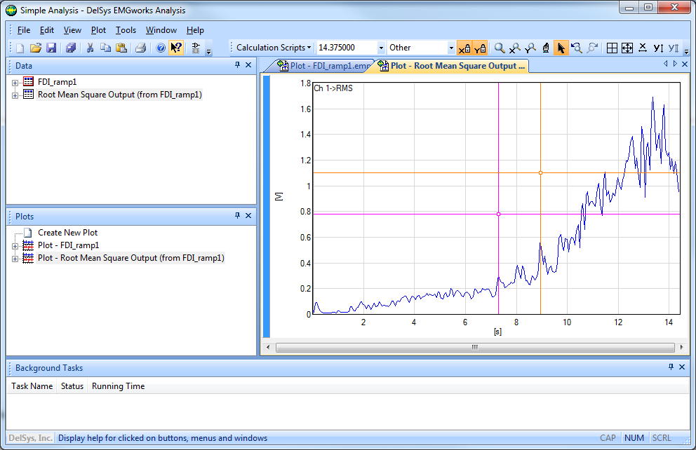 2. Click the OK button to perform the RMS calculation using the default Options. The RMS calculation will be added to the Workspace. In addition the result will be automatically plotted if the Plot Results check box was checked. If the data is not automatically plotted, right click the output series in the Data pane and choose Plot Separately. Choose Plot > Autoscale from the Main Menu to autoscale the plot in the x and y axes.