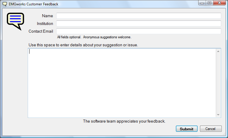 EMGworks has built in support and customer feedback features which are available under the Help menu. In the event that there is an error in EMGworks, you will be automatically prompted to submit information about the error to Delsys. No personal information is included, and we urge you to add any context regarding what you were doing that caused the error and submitting it to us. If you encounter an error in the software which does not automatically display this dialog, or if you have a suggestion for a future version of EMGworks, you may bring up this dialog at any time by choosing Send Feedback to Delsys from the Help menu.