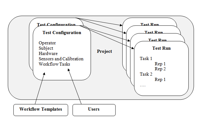 A given test configuration can be run many times. Each test run is associated with two users: an operator and a subject. As the tasks in the configuration are run, data is grouped in a set run for each task. If the task is run repeatedly, this data will be groups in a rep run within the set. It is possible to skip tasks in the protocol or repeat them while doing a test run. In addition to the data, each set also contains additional information about normalization parameters and other task-specific information.